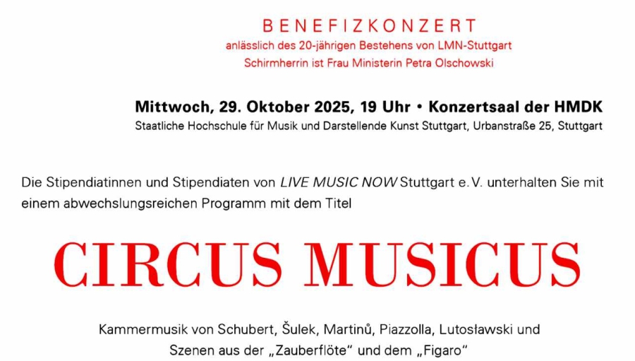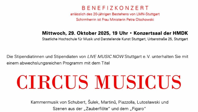 „CIRCUS MUSICUS“ war der Titel des Konzertes am 29. Oktober 2025 vor einem - bis zum letzten Platz gefüllten - Konzertsaal der Staatlichen Hochschule für Musik und Darstellende Kunst (HMDK) Stuttgart. 400 Gäste, Förderer, Sponsoren und Unterstützer waren gekommen, um ein farbiges und temperamentvolles Konzert mitzuerleben.