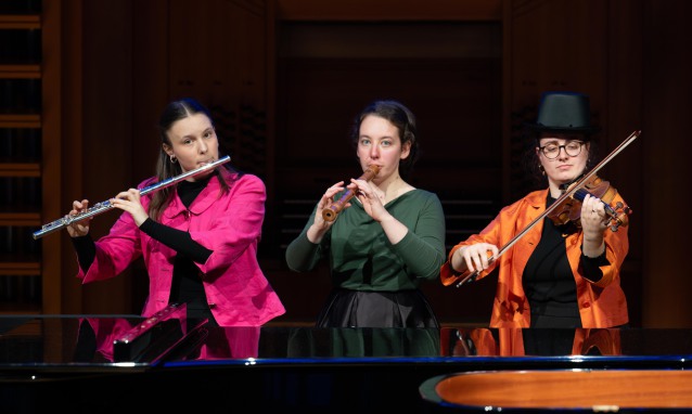 Kleine amüsante Intermezzi mit Melodien aus Mozarts „Zauberflöte“ gestalteten drei Studierende des Studiengangs „Elementare Musikpädagogik“ (Betreuung: Gudrun Bosch) in farbenfroher Kostümierung.